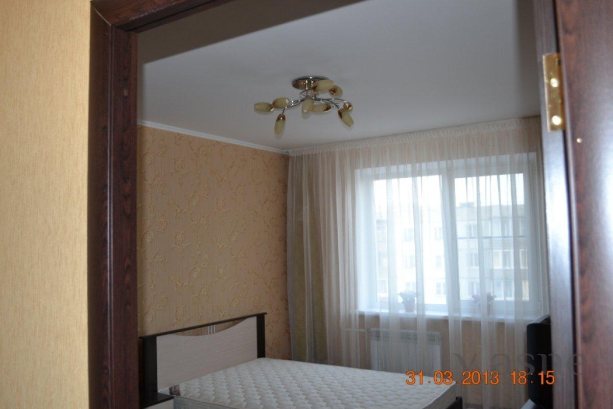 One bedroom apartment for rent in Smolensk. The apartment is renovated, plastic windows, metal door. This apartment is very bright, clean and comfortable at home. The apartment has a spacious entrance hall, a fitted wardrobe with ironing board and iron. The room is a comfortable double bed with orthopedic mattress, single sofa, chest of drawers under the TV and DVD, coffee table.