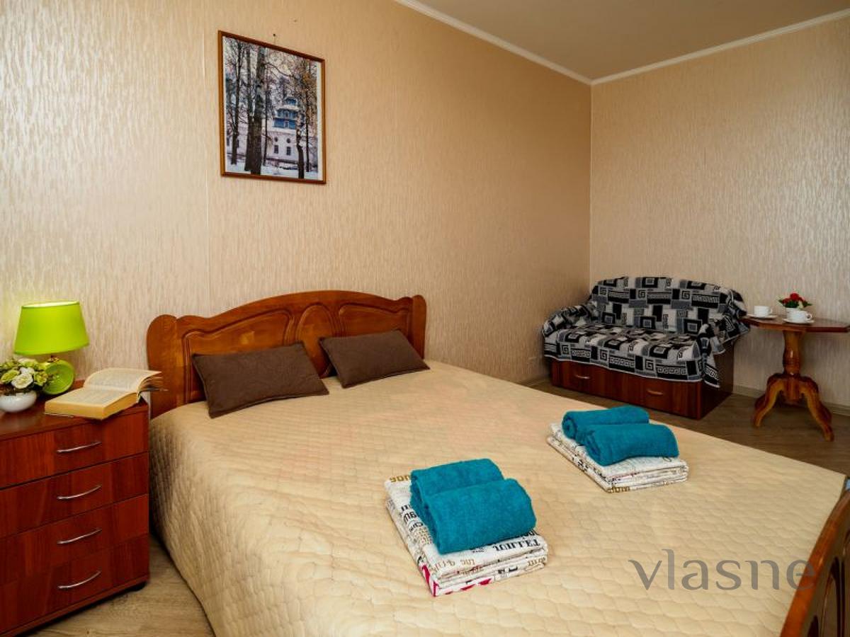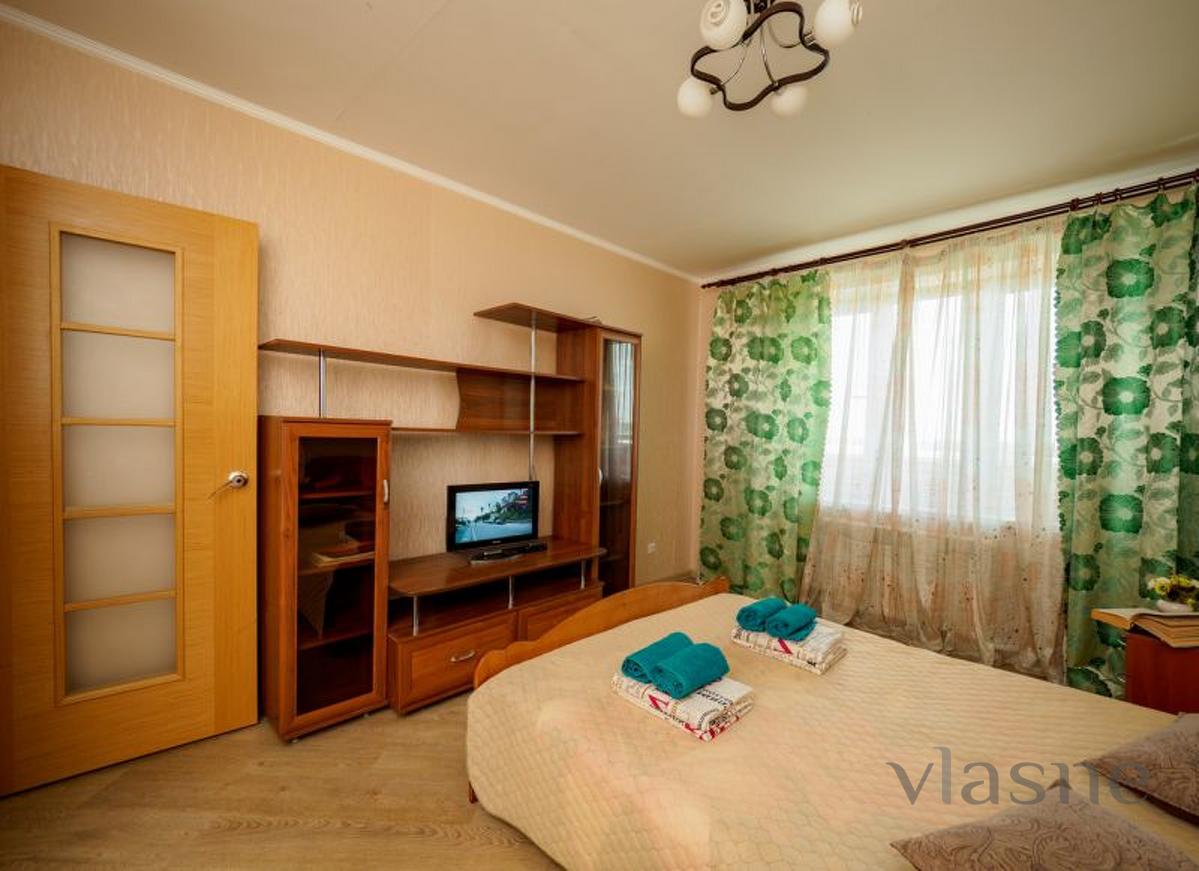 Bright, stylish, comfortable one-room apartment in good repair in a new building. New apartment, bright stylish interior and convenient location. Large double bed, single sofa, three sleeping places. An LCD TV and unlimited Internet will help you spend your leisure time. Check out time: 12.00 noon. Documents confirming accommodation: hotel standard reporting documents with receipts and a QR code in the cash register receipt.